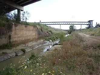 El arroyo del Tamarguillo a su paso por San Jerónimo. Al fondo puede verse el puente de la estación de Renfe de San Jerónimo. | ||