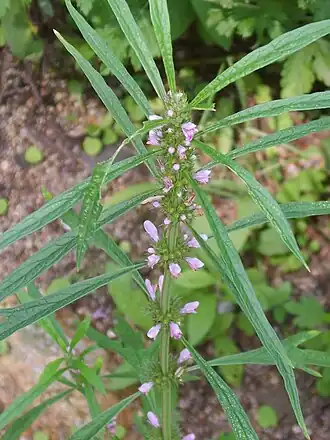 Espécimen de yìmǔcǎo (益母草) (Leonurus japonicus), planta medicinal en la fitoterapia china indicado para los desórdenes menstruales, infertilidad, dolores abdominales, dolores postparto, hematuria, hipertensión. | ||