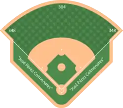 Jardín izquierdo: 106 m/ 348 pies Jardín central: 120 m/ 384 pies Jardín derecho: 106 m/ 348 pies m | |