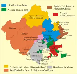 Agencia de Bikaner (al noroeste) dentro de la agencia de la Rajputana; Bikaner fue una de las dos agencias formadas solo por un principado. | |||||||||