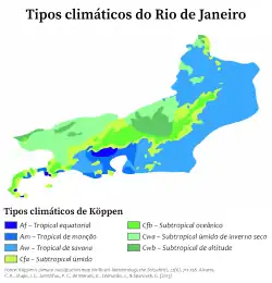 En el estado de Río de Janeiro predominan los climas tropicales (en las tierras bajas) y los climas tropicales de altura (en las tierras altas). En la región metropolitana de Río de Janeiro predomina el clima tropical semihúmedo, con lluvias abundantes en verano, inviernos muy calurosos y secos, con temperaturas suaves. La temperatura media anual oscila entre 22 °C y 24 °C y la precipitación pluvial oscila entre 1000 y 1500 mm por año. En los puntos más altos de la comarca de la Serrana, observamos el clima tropical de altura, pero con veranos algo calurosos y lluviosos e inviernos fríos y secos. La temperatura media anual es de 16 °C. En la mayor parte de la Serra Fluminense, el clima también es tropical en las elevaciones más altas, pero con veranos que varían entre calurosos y templados y mayormente lluviosos, e inviernos fríos y secos, con fuertes lluvias, que se acercan a los 2.500 mm por año en algunas regiones.[5][6][7]