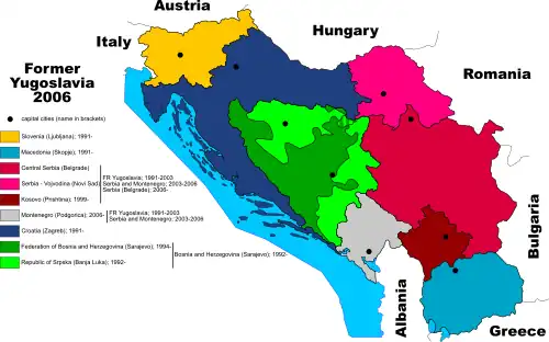 - ↑ «History of Serbia: the break-up of SFR Yugoslavia (1991–1995)». Serbia Info (en inglés). Belgrado: Gobierno de Serbia. Archivado desde el original el 22 de diciembre de 2007. Consultado el 24 de junio de 2019.