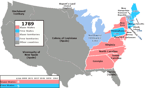 En 1804 (incluyendo, Nueva York (1799), Nueva Jersey (1804)), en todos los estados del norte se había abolido la esclavitud o habían tomado medidas destinadas a reducirla gradualmente.[4] En el sur, Kentucky fue creado como un estado esclavista a partir de Virginia (1792), y Tennessee se había creado como un estado esclavista de Carolina del Norte (1796). En 1804, antes de la creación de nuevos estados de los territorios occidentales federales, el número de estados esclavistas y estados libres era de ocho cada uno. En el uso popular, la división geográfica entre el esclavo y estados libres se llama la línea Mason-Dixon.