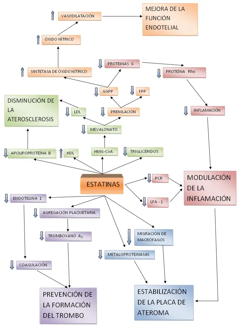 - A través de estos potenciales efectos sobre las proteínas celulares, las estatinas pueden tener una serie de propiedades antiateroscleróticas y antitrombóticas, como la inhibición del crecimiento de la célula muscular lisa, la adhesión celular, la activación plaquetaria y la secreción de proteína C reactiva, entre otras.[10]