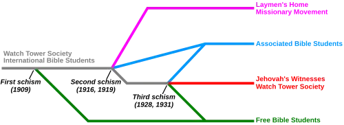 Una serie de cismas dentro de las congregaciones de Estudiantes de la Biblia asociadas con la Sociedad Watchtower entre 1909 y 1931, culminaron con la disolución de facto del movimiento religioso y su escisión en diversas confesiones y movimientos religiosos. El cisma más significativo comenzó en 1917 después de la elección de Rutherford como presidente de la Sociedad Watch Tower dos meses después de la muerte de Russell. El cisma comenzó con el controvertido reemplazo por parte de Rutherford de cuatro miembros de la junta directiva de la Sociedad y la publicación de The Finished Mystery en julio de 1917. Miles de miembros abandonaron las congregaciones de Estudiantes de la Biblia asociados con la Sociedad Watchtower durante las décadas de 1920 y 1930, debido a las predicciones fallidas de Rutherford para el año 1925, la creciente desilusión con sus continuos cambios doctrinales y organizativos, el personalismo ideológico adoptado por Rutherford y su campaña por el control centralizado de la Iglesia.[2]
