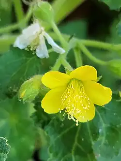 Las hojas tienen pecíolos de 2 a 3 cm de largo y 0.3 cm de ancho; con láminas de 3 a 7 cm diámetro, más anchas que largas, casi circulares, ápice redondeado, margen lobado a sinuado dentado, el haz y el envés presentan tricomas largos, lisos y otros provisto de pequeños ganchos abundantes en las nervaduras del envés, palmatinervadas (como la palma de la mano).