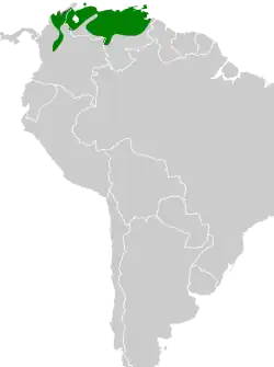 Se encuentra en las selvas tropicales del norte de Colombia, Venezuela y Trinidad y Tobago.