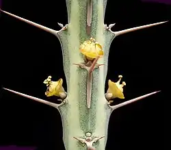 Euphorbia: nombre genérico que deriva del médico griego del rey Juba II de Mauritania (52 a 50 a. C. - 23), Euphorbus, en su honor – o en alusión a su gran vientre – ya que usaba médicamente Euphorbia resinifera. En 1753 Carlos Linneo asignó el nombre a todo el género.[3]