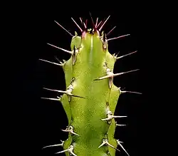 Es un arbusto suculento, densamente ramificado desde la base, erecto que alcanza 1 m de altura, ramas escasamente ramificadas, prominentes en número de 6-8 en ángulo, de 1-3 cm de espesor; ángulos superficialmente dentados, con dientes de 6-12 mm de separación; espinosa.[1]