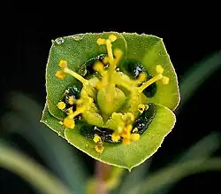 Euphorbia: nombre genérico que deriva del médico griego del rey Juba II de Mauritania (52 a 50 a. C. - 23), Euphorbus, en su honor – o en alusión a su gran vientre – ya que usaba médicamente Euphorbia resinifera. En 1753 Carlos Linneo asignó el nombre a todo el género.[3]