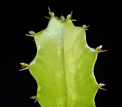 Es un arbusto como candelabro o pequeño árbol que alcanza un tamaño de 4,5-6 m de altura, al parecer sin un tronco distintivo forma grupos grandes de 12 metros de diámetro, los nuevos brotes que surgen de la base, con ramas 3-6 angulares, de 4,5 cm de ancho, constreñido en intervalos de hasta 4,5 cm de largo, los ángulos algo alados.[1]
