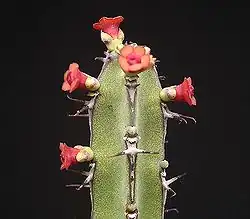 Euphorbia: nombre genérico que deriva del médico griego del rey Juba II de Mauritania (52 a 50 a. C. - 23), Euphorbus, en su honor – o en alusión a su gran vientre – ya que usaba médicamente Euphorbia resinifera. En 1753 Carlos Linneo asignó el nombre a todo el género.[5]