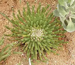 Es una planta suculenta muy enana, sin espinas y sin hojas, el tallo principal enterrado en el suelo cerca de la parte superior, en forma de bastón, de 4-8 mm de espesor, con la parte central de la parte superior plana o ligeramente deprimida, cubierta con tubérculos cónicos agudos y la parte exterior, en el que una roseta (que en las plantas antiguas alcanzan hasta 18 cm de diámetro.) de las ramas muy numerosas, se agrupan en varias series, glabras, verde en las partes jóvenes, convirtiéndose en marrón claro con la edad. Las hojas son rudimentarias, diminutas, pronto caducas. Las inflorescencias en pedúnculos agrupados en los extremos de las ramas; brácteas oblongas u oblongo-espatuladas, glabras; ciliado; involucros amplios y poco profundo en forma de copa, glabros, excepto en la parte posterior de los lóbulos. La cápsula y las semillas no se ven.[3]