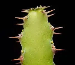 Es una planta suculenta y espinosa, sin hojas, con las ramas constreñidos en segmentos, 3-4 angular, glabra,. de color verde claro en las partes jóvenes, llegando a ser verde grisáceo con la edad, los ángulos agudos, con caras planas entre ellas, con dientes sinuosos, a veces ondulados, con márgenes grises; las hojas muy rudimentarias, en forma de escamas, amplias, pronto caducas; flores de los ojos sentados casi a medio camino entre la columna vertebral de pares.[4]