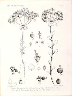Es una planta anual, laxamente velutinas. Tallos de 25-35 cm, erectos, simples. Hojas de hasta 45 x 18 mm; las inferiores pecioladas; las superiores sentadas, obovadas u oblanceoladas, obtusas, fina e irregularmente serruladas. La inflorescencia con 5 radios, 4-5 radios secundarios divididos hasta 3 veces y 4-7 radios axilares insertos casi desde la base. Brácteas de 25-40 x 12- 16 mm, obovado-oblongas u oblongo-elípticas. Bracteolas de las umbelas secundarias de 12-22 x 8-12 mm, obovadas; el resto de las bracteolas anchamente ovadas u ovado-rómbicas. Glándulas trasovadas, amarillas. Cápsulas de 1,5-2 x 2,5-3 mm, surcadas, tuberculadas. Semillas de 1,5-1,7 x 1,4 mm, lisas, pardas. Carúncula muy pequeña. Florece y fructifica de marzo a mayo.[1]