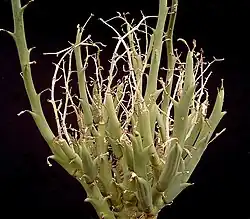 Es un arbusto perennifolio y carnoso que alcanza un tamaño de 0,45-1 m de altura, muy ramificada desde la base, el tallo primario de ± 2,5 cm de espesor, las ramas jóvenes convergentes hacia arriba, sin hojas, las ramas que se bifurcan alternativamente, formando una laxa parte superior plana en corimbo, de 10-15 cm de diámetro; es dioica.[2]
