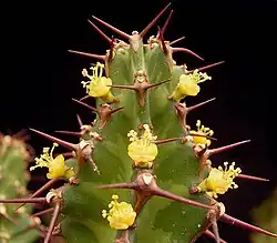 Euphorbia: nombre genérico que deriva del médico griego del rey Juba II de Mauritania (52 a 50 a. C. - 23), Euphorbus, en su honor – o en alusión a su gran vientre – ya que usaba médicamente Euphorbia resinifera. En 1753 Carlos Linneo asignó el nombre a todo el género.[5]