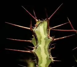 Es una planta suculenta perennifolia con una raíz carnosa y ramas entrelazadas que alcanza un tamaño de 40 cm de alto, ramas tetrangulares, de ± 1 cm de grosor, los ángulos con dientes prominentes de ± 1,5 cm de largo; espinosas.[1]