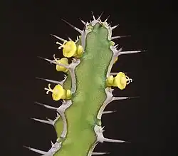 Euphorbia: nombre genérico que deriva del médico griego del rey Juba II de Mauritania (52 a 50 a. C. - 23), Euphorbus, en su honor – o en alusión a su gran vientre – ya que usaba médicamente Euphorbia resinifera. En 1753 Carlos Linneo asignó el nombre a todo el género.[5]