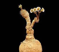 Es una planta suculenta tuberosa con inflorescencias en ciatios.