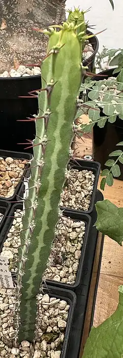 Es una planta suculenta arbustiva sin espinas que alcanza un tamaño de 0,6(-1,5) m de altura, generalmente poco ramificada desde la base y densamente ramificada arriba de hábito más robusto, con un tallo de 5 cm de grosor en la subsp. fluviatilis.