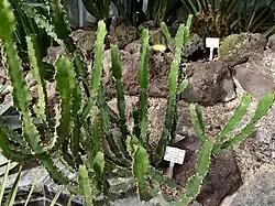 - ↑ «Euphorbia tetracanthoides». Conservatorio y Jardín Botánico de Ginebra: Flora africana. Consultado el 24 de abril de 2013.