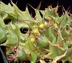 Es una planta suculenta, cespitosa perennifolia espinosa enana, arbusto con una amplia raíz tuberosa alargada fusionada en un tallo subterráneo corto para formar un cuerpo de 30x15 cm.