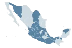 Ciudad de México,[2] Coahuila,[3] Aguascalientes,[4] San Luis Potosí,[5] Michoacán de Ocampo,[6] Tabasco,[7] Hidalgo,[8] Guanajuato,[9] Guerrero,[10] Nayarit,[11] México,[12] Colima,[13] Oaxaca,[14] Yucatán,[15] Tlaxcala,[16] Zacatecas,[17] Veracruz ,[18] Jalisco[19] y Sonora.[20]