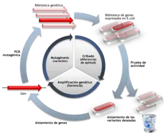 - El fomento de la variabilidad en el ácido nucleico codificante de la proteína de interés mediante mutagénesis o recombinación al azar. Las técnicas usuales son la PCR en condiciones de baja astringencia (es decir, proclive a error) y el Barajado de ADN (en inglés, DNA shuffling).
