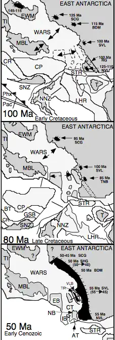 - ↑ a b c Fitzgerald, Paul (2002). «Tectonics and landscape evolution of the Antarctic plate since the breakup of Gondwana, with an emphasis on the West Antarctic Rift System and the Transantarctic Mountains». Royal Society of New Zealand Bulletin 35: 453-469.