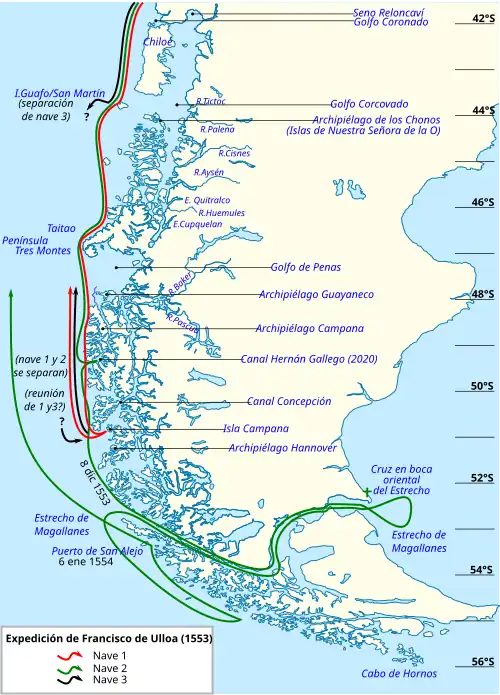 A los 44° de latitud sur (según la graduación que da el documento) se perdieron de vista y separaron las naves. Un camino siguió la comandada por Hernán Gallego y la de Cortés Ojeda, Hojea u Ogea — quienes también se separaron a los 48° – y otro la que iba al mando del comandante Ulloa, donde iba a bordo también Jerónimo de Vivar...M. X. Urbina: 55–56