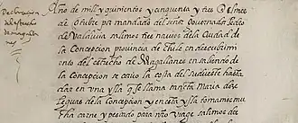 El primero de ellos es la Crónica y relación copiosa y verdadera de los reinos de Chile escrita por Jerónimo de Vivar en 1558. Vivar relata el viaje al sur de Chile en primera persona, pero Mario Orellana Rodríguez sostiene que Vivar no puede haber participado en la expedición y que el uso de la primera persona en su relato es solo un recurso narrativo.[2]: 42 [notas 1]
