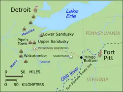 A pesar del ataque a su familia, el Capitán Pipe dijo que no buscaría venganza.[10] En cambio, en septiembre de 1778, fue uno de los firmantes del Tratado de Fort Pitt entre los Lenapes y los Estados Unidos. Los americanos esperaban que este acuerdo permitiera a los soldados americanos atravesar el territorio Lenape y atacar Detroit, pero la alianza se deterioró tras la muerte de White Eyes, el jefe Lenape que había negociado el tratado. Eventualmente, el Capitán Pipe se volvió contra los americanos y trasladó a sus seguidores al oeste hasta el río Sandusky, donde recibió apoyo de los británicos en Detroit.[11][a] Durante los siguientes años, americanos y nativos lanzaron incursiones unos contra otros, generalmente dirigidas contra asentamientos.[12] En 1780, cientos de colonos de Kentucky fueron asesinados o capturados en una expedición británico-nativa en Kentucky.[13] George Rogers Clark de Virginia respondió en agosto de 1780 liderando una expedición que destruyó dos pueblos Shawnee a lo largo del Río Mad, pero hizo poco daño al esfuerzo bélico nativo.[14] Como la mayoría de los Lenapes se habían vuelto probritánicos para entonces, el Coronel americano Daniel Brodhead lideró una expedición al país de los Ohio en abril de 1781 y destruyó el pueblo Lenape de Coshocton. Clark luego reclutó hombres para una expedición contra Detroit en el verano de 1781, pero los nativos derrotaron decisivamente a cien de sus hombres a lo largo del río Ohio, poniendo fin efectivamente a su campaña. Los sobrevivientes huyeron a los pueblos militantes en el río Sandusky.[15]