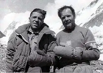 - ↑ Los miembros del equipo fueron, desde la izquierda de pie: Ubaldo Rey, Ugo Angelino, Walter Bonatti, Ardito Desio (jefe, brazos cruzados), Lino Lacedelli, Erich Abram, Gino Soldà, Achille Compagnoni, Cirillo Floreanini. Desde la izquierda sentados: Sergio Viotto, Mario Fantin (cámara), Guido Pagani (doctor), Pino Gallotti.