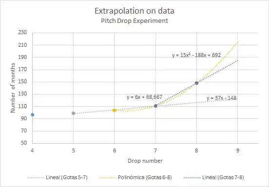 Se pueden realizar algunas estimaciones muy sencillas sobre cuándo debería caer la siguiente gota basándose en los datos de las gotas anteriores, teniendo en cuenta de éstas, su aceleración, su recta y su parábola, para así proyectar la próxima caída. Así pues, si se omite el dato de la gota 8, la gota 9 debería haber caído en torno a enero de 2011. Las condiciones del experimento han ido cambiando paulatinamente con en tiempo en los últimos 20-30 años. Considerando que la gota tuviera el mismo periodo que la anterior, la fecha de caída debió haber sido en torno a marzo de 2013. Finalmente la caída de la novena gota ocurrió el 17 de abril de 2014.