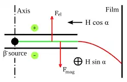 Por lo tanto, Alfred Bucherer (1908) realizó una medición más precisa utilizando un filtro de velocidad similar al de Bestelmeyer (véanse las figuras 4 y 5). Se colocó una fuente del elemento radio capaz de emitir partículas beta en el centro de un condensador circular que constaba de dos placas de vidrio plateado espaciadas 0,25 mm y cargadas a aproximadamente 500 voltios, colocadas en un campo magnético homogéneo de 140 Gauss. El radio emitía rayos beta en todas direcciones, pero en cualquier dirección particular α, solo salían del filtro de velocidad aquellas partículas cuya velocidad era tal que los campos eléctrico y magnético se compensaban exactamente entre sí. Después de salir del condensador, los rayos eran desviados por el campo magnético e incidían sobre una placa fotográfica paralela al borde del condensador y perpendicular a los rayos no desviados.[22][23]