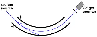 Walter Kaufmann comenzó a experimentar con partícula beta usando un dispositivo similar a un tubo de rayos catódicos, donde la fuente de los electrones era la desintegración de una fuente del elemento radio que se colocaba en una cámara sometida al vacío (véase la figura 1). Estos rayos emitidos por el radio se llamaban en ese momento "rayos Becquerel". A diferencia de los entonces conocidos como rayos catódicos, que alcanzaban velocidades de solo 0,3c, siendo c la velocidad de la luz, los rayos de Becquerel alcanzaban velocidades de hasta 0,9c. Sin embargo, como las partículas beta tienen diferentes velocidades, la radiación no era homogénea. Por lo tanto, Kaufmann aplicó campos eléctricos y magnéticos alineados y paralelos entre sí, de modo que las deflexiones causadas fueran perpendiculares entre sí. Sus impactos sobre una placa fotográfica produjeron una curva de desviación, cuyos puntos individuales correspondían a una determinada velocidad y a una determinada masa de los electrones. Invirtiendo la carga en el condensador, invirtiendo así el campo eléctrico, se podían obtener dos curvas simétricas, cuya línea central determinaba la dirección de la desviación magnética.[A 4][A 5]