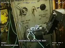 En la mañana del 22 de abril, el suboficial de la Guardia Costera Ashley Butler declaró que "el petróleo se estaba escapando de la plataforma a un ritmo de unos 340 000 galones estadounidenses; 1.300.000 litros) de crudo por día".[57] Esa tarde la Guardia Costera El suboficial sénior Michael O'Berry utilizó la misma figura. Se enviaron dos vehículos submarinos operados por control remoto (ROV) en un intento de tapar el pozo, pero no tuvieron éxito.[42] Butler advirtió sobre una fuga de hasta 700000 galones estadounidenses de combustible diésel, y el vicepresidente de BP, David Rainey, calificó el incidente como un posible "derrame importante".[42] El 23 de abril, según los informes, un ROV no encontró ninguna fuga de aceite. de la plataforma hundida y no fluye petróleo del pozo.[58] La contralmirante de la Guardia Costera Mary Landry expresó un optimismo cauteloso de impacto ambiental cero, afirmando que no emanaba petróleo ni de la boca del pozo ni de las tuberías rotas y que el petróleo derramado por la explosión y el hundimiento estaba siendo contenido.[59][60][61][62] El 24 de abril, Landry anunció que una boca de pozo dañada estaba derramando petróleo en el Golfo y lo describió como "un derrame muy grave".[63]