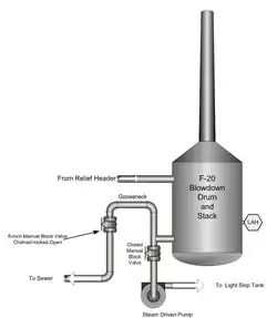 El exceso de vapores y líquidos de hidrocarburos procedentes del venteo y el alivio se enviaba al recipiente F-20, una chimenea de purga. Se trataba de un tambor vertical de 10 pies (3,0 m) de diámetro con un conducto de humos vertical de 113 pies (34 m). La F-20 se puso en servicio en la década de 1950 y había sufrido varias modificaciones a lo largo de los años.[21]