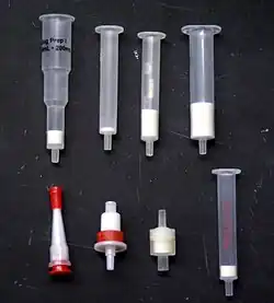 La extracción en fase sólida (SPE, por sus siglas en inglés Solid Phase Extraction) es una técnica de extracción mediante la cual se pueden separar compuestos disueltos o suspendidos en una mezcla líquida de acuerdo con sus propiedades físicas y químicas. Esta técnica permite la concentración del analito y la remoción de impurezas.[1] La SPE permite aislar analitos de interés de una amplia variedad de matrices incluyendo orina, sangre, agua, bebidas, suelo y tejidos animales.[2][3][4]