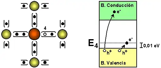 En cambio si se ha dopado con elementos trivalentes (Al, B, Ga o In), las impurezas aportan una vacante, por lo que se las denomina aceptoras (de electrones, se entiende). Ahora bien, el espacio vacante no es un hueco como el formado antes con el salto de un electrón, sino que tiene un nivel energético ligeramente superior al de la banda de valencia (del orden de 0,01 eV).