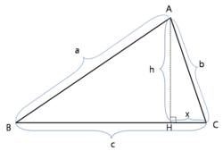 La altura de un triángulo de base a tiene una longitud Como , se llega finalmente a: Se utilizó la factorización de dos cuadrados en dos etapas diferentes. |