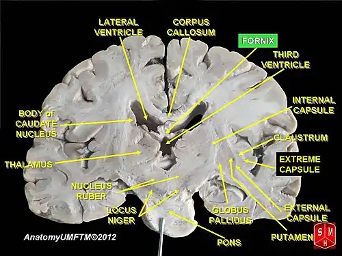 El fórnix es una estructura de sustancia blanca también llamada trígono o «bóveda de 4 pilares» por poseer 2 proyecciones anteriores y 2 posteriores también llamados pilares o columnas.