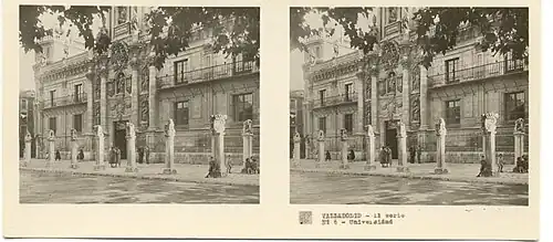 Las primeras noticias ciertas que poseemos sobre la localización de la sede de la Universidad de Valladolid datan de los últimos años del siglo XV, cuando el Estudio ya contaba con dos siglos de existencia, tras el traslado de la institución desde la Colegiata hasta su nuevo emplazamento. Constaba de un claustro de cuatro lados, al que se abrían las aulas, y una capilla tardogótica de cierta magnitud. Al claustro se entraba por una portada, también tardogótica, que se abría a la calle Librería. A principios del siglo XVIII, este edificio resultaba insuficiente, por lo que se amplió con otro claustro cuadrangular, con cuatro galerías, al que se abrían varias aulas construidas en el mismo momento.