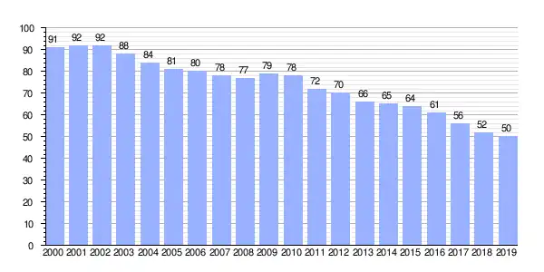 | Gráfica de evolución demográfica de Faeira (lugar) entre 2000 y 2019 |
