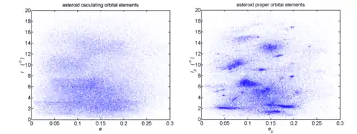 Cuando se trazan los elementos orbitales de los asteroides del cinturón principal (normalmente inclinación de la órbita frente a excentricidad o frente a semieje mayor), se observan algunas concentraciones distintas con relación a la distribución bastante uniforme del resto de asteroides en general. Estas concentraciones son las familias de asteroides.