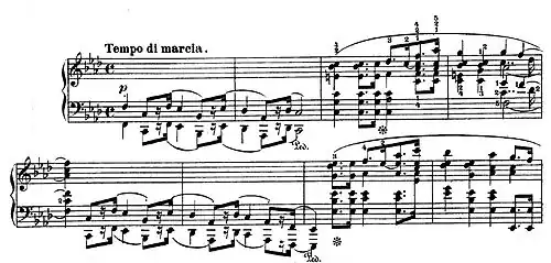 Como ejemplo, se puede examinar la sección introductoria y la música subsiguiente. La obra comienza con una secuencia en fa menor, que inicia una sección de cierta extensión, oscura a modo de conmovedora marcha fúnebre en tempo di marcia. Se trata de un homenaje a los muertos en la revolución polaca. El material de esta parte no reaparece a lo largo de la pieza, sin embargo, estamos ante un motivo o "idea musical" formado por una escala descendente de cuatro notas que constituye una especie de hilo conductor en la obra. Esta primera sección está firmemente afianzada, aunque con alguna desviación, en la tonalidad de fa menor y su regularidad rítmica le proporciona un contraste respecto de lo que sigue justamente a continuación.