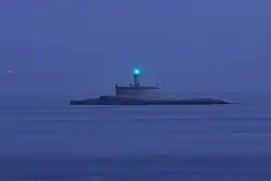 El faro emite un destello de luz verde durante 1 segundos en un ciclo total de 5 s. Tiene un alcance nominal nocturno de 15 millas náuticas.[1]