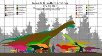 En la península ibérica han convivido varias especies de dinosaurios de varias regiones, sobre todo africanos y europeos. El registro fósil más amplio procede del Cretácico Inferior. Hay varios géneros endémicos, como Aviatyrannis del Jurásico Superior, Pelecanimimus o Aragosaurus, del Cretácico Inferior, o Arenysaurus del Cretácico Superior. Hay géneros que también estuvieron presentes en Europa, como Iguanodon o Rhabdodon. En esta lista se encuentran los géneros de dinosaurios encontrados en la península ibérica: