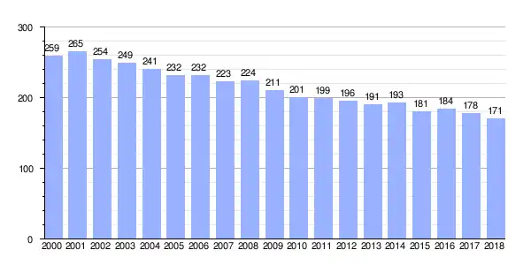 | Gráfica de evolución demográfica de Feás entre 2000 y 2018 |